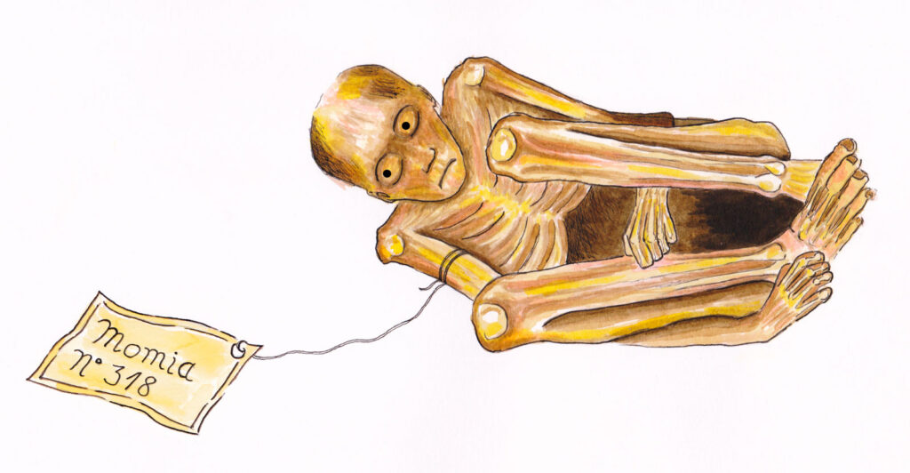 A video animation by Marcela Moraga is projected as a loop onto the central textile. It is based on a series of drawings made by hand with pencil and ink on paper. The images show the burial of a man accompanied by a jar, a woven bag, a corn cob and coca leaves. A weave links all these elements like a constellation. The subsequent drawings document the complete dismemberment of the grave into its individual parts: vessel, bag, corn cob and leaves are transformed into singular museum objects, while the indigenous body is also objectified in a western knowledge system and cataloged as a “mummy”. In further drawings, the hands of the women of the Suyis Liq’ cau collective can be seen weaving and linking together as a symbolic act of repair – as a response to an endlessly repeating process of destruction and as an expression of their persistent demands for restitution. In 1993, the Lickanantay people, also known as the Atacameño, began to demand the return of their ancestors. The series of grave robberies took place between 1850 and 1970, and many Lickanantay grandparents were still displayed unprotected in museum showcases until the beginning of the 21st century. Today, their remains are held in museum repositories and universities in Chile, the United States, Spain and Germany. Most of the offerings and objects placed in the tombs were lost during the plundering; only a few ceramics and textiles remain scattered in various museum collections today.
