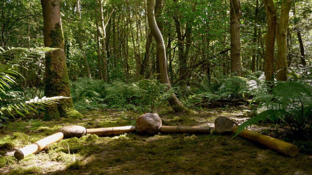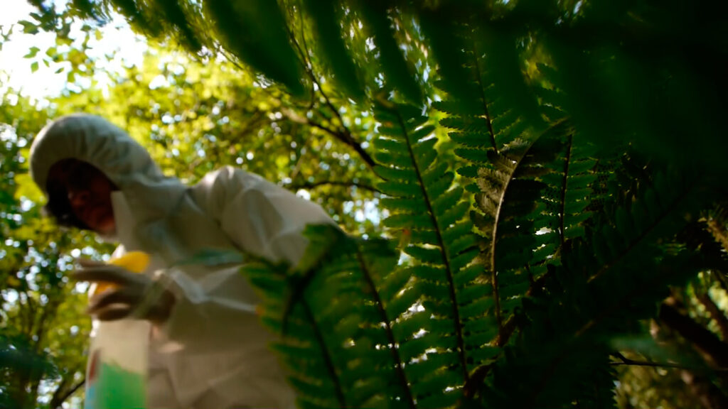 In Protección de los Sentidos (Protection of the Senses) Marcela Moraga performs an important human routine in a forest: cleaning. The artist obsessively cleans tree trunks, plants, stones, and soil found in the area with various cleaning tools and products (fake). She then rearranges certain elements of the forest in this newly cleaned space.